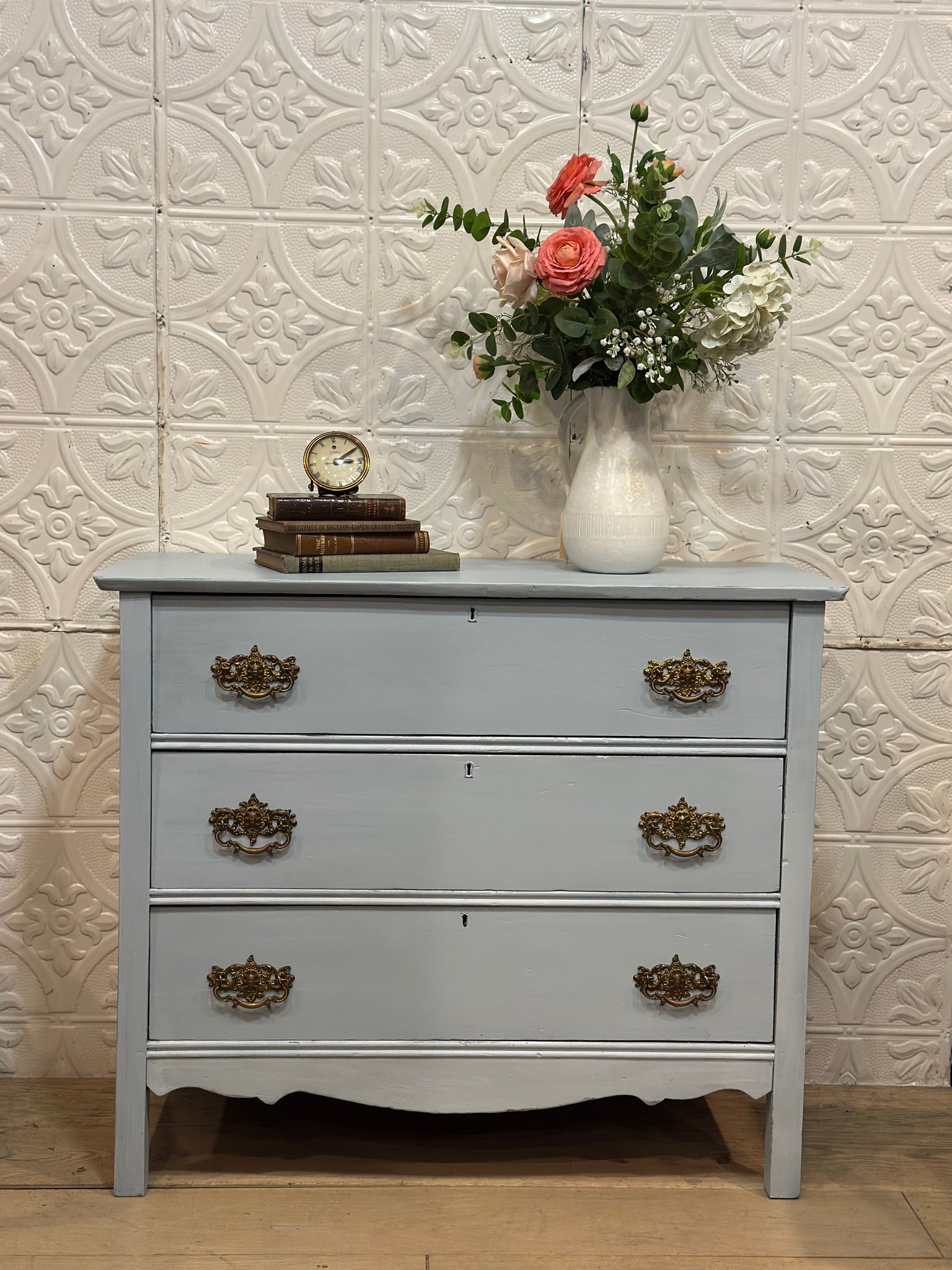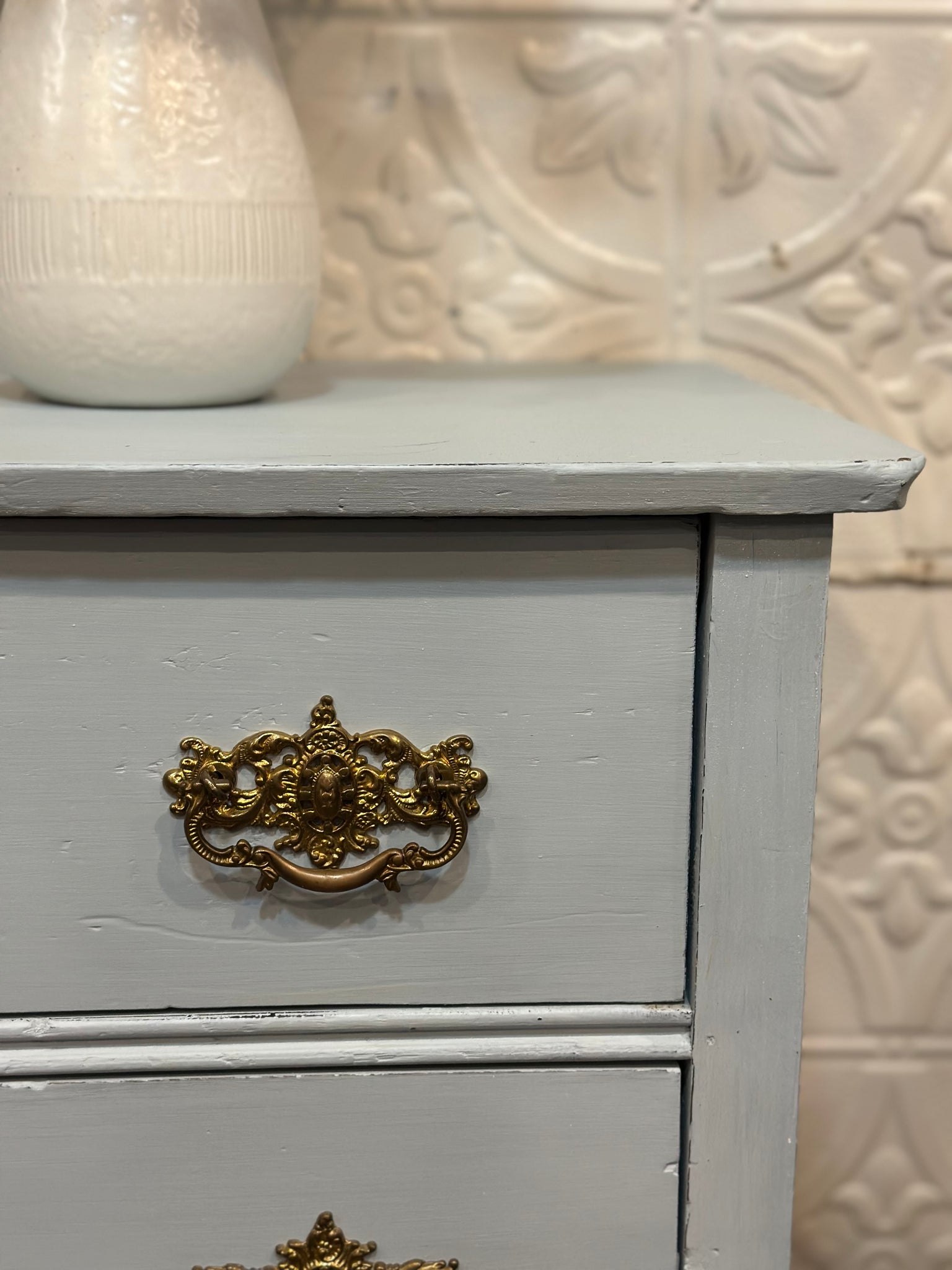 This adorable Antique Dresser has been redone in a custom blend of Miss Mustard Seed’s milk paint. It is a very pale blue with 3 lined drawers and absolutely gorgeous original hardware. It’s the perfect size for beside a bed.