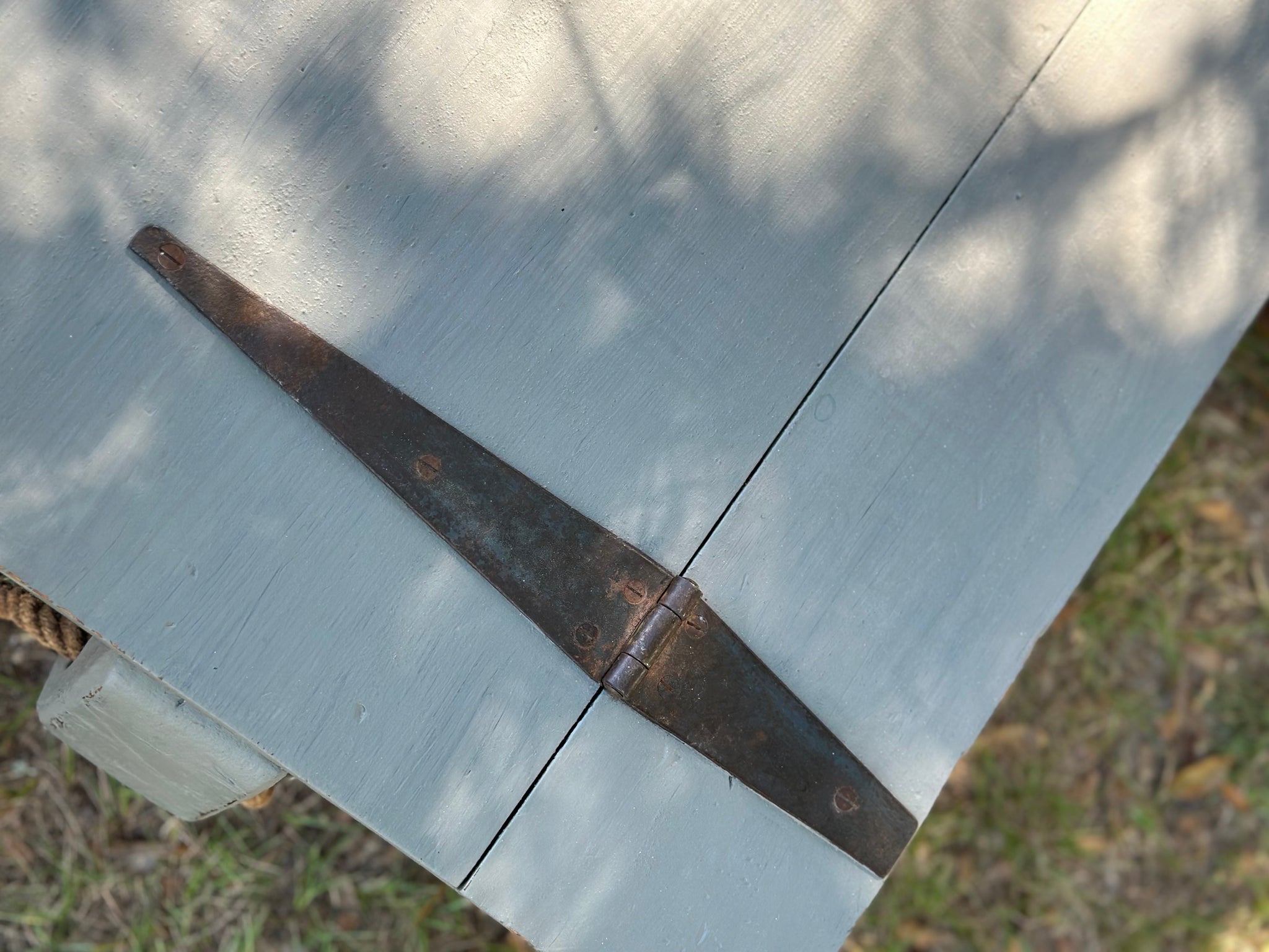 This is a great old Primitive carpenter’s chest. It has great cast iron latches and rope handles. It has been painted in Miss Mustard Seed’s Trophy a great grey! It has scuffs, scratches and character. It would be so cute as a coffee table or on a front porch filled with seasonal decor.