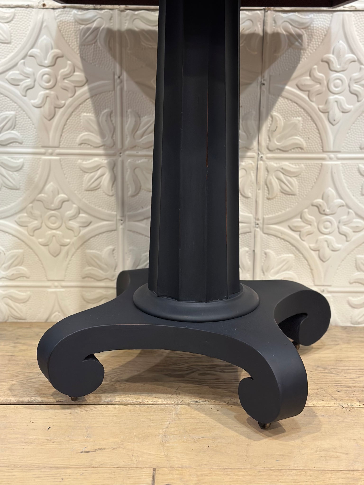 This gorgeous empire style side table has been panted in a bespoke color of Wise Owl Black and Inkwell creating a very dark blue. The top swivels making it a perfect top for a laptop. It would also make a great plant stand. It is on its original casters.