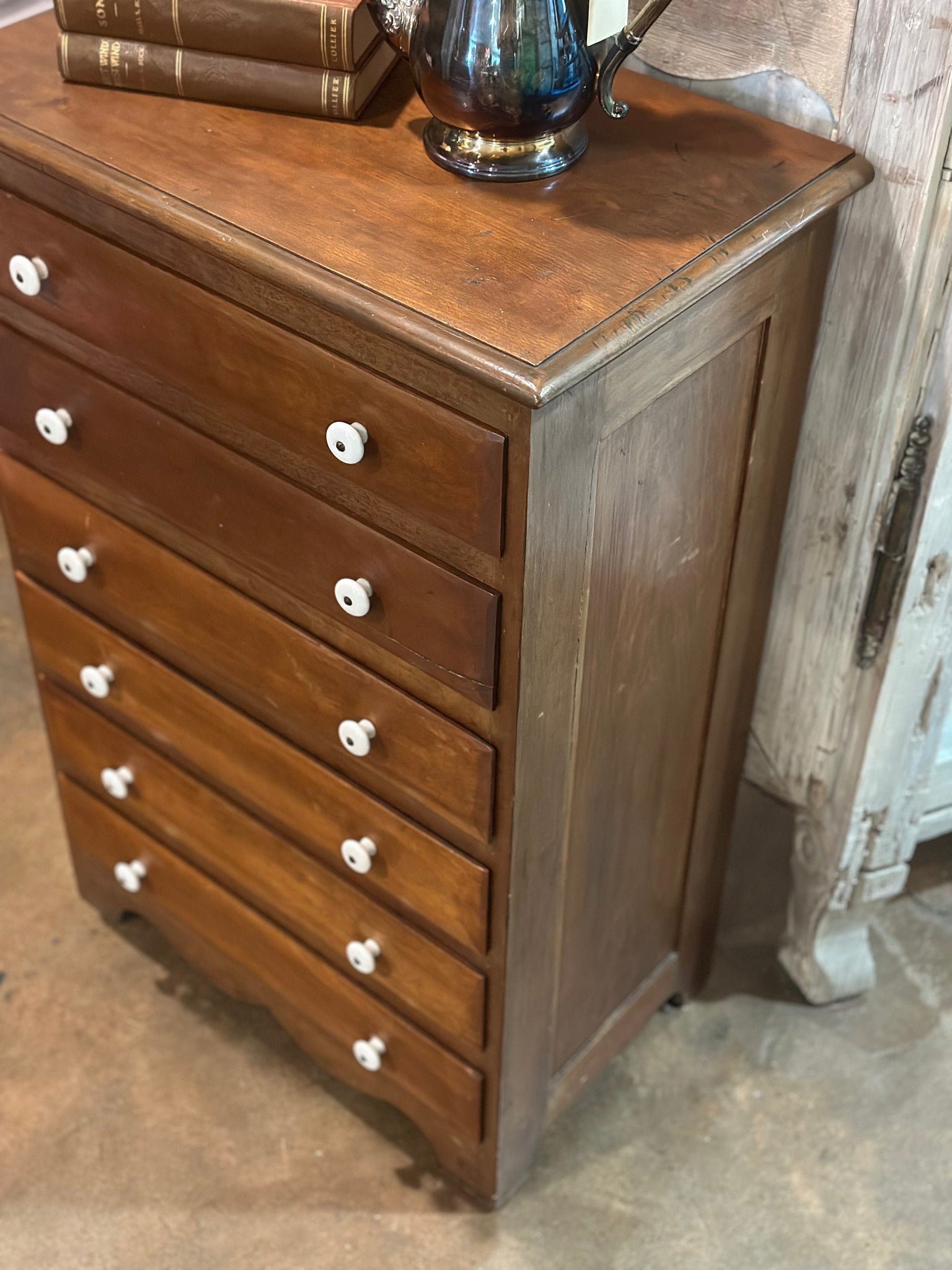 This is an adorable antique primitive salesman sample or child’s dresser. It features 6 drawers with original handles. It would be perfect for a paper crafter sitting on top of another piece or of course for a small child’s dress up area! please note measurments this piece is not a full size dresser.