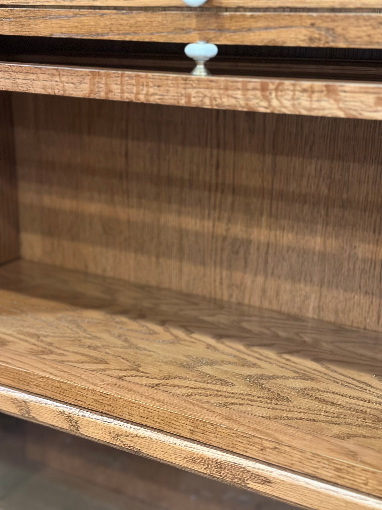 Although this is a reproduction barrister bookcase it still has a great look to it. It is one piece and has 4 shelves with glass fronts that retract. The top section has beautiful leaded glass.