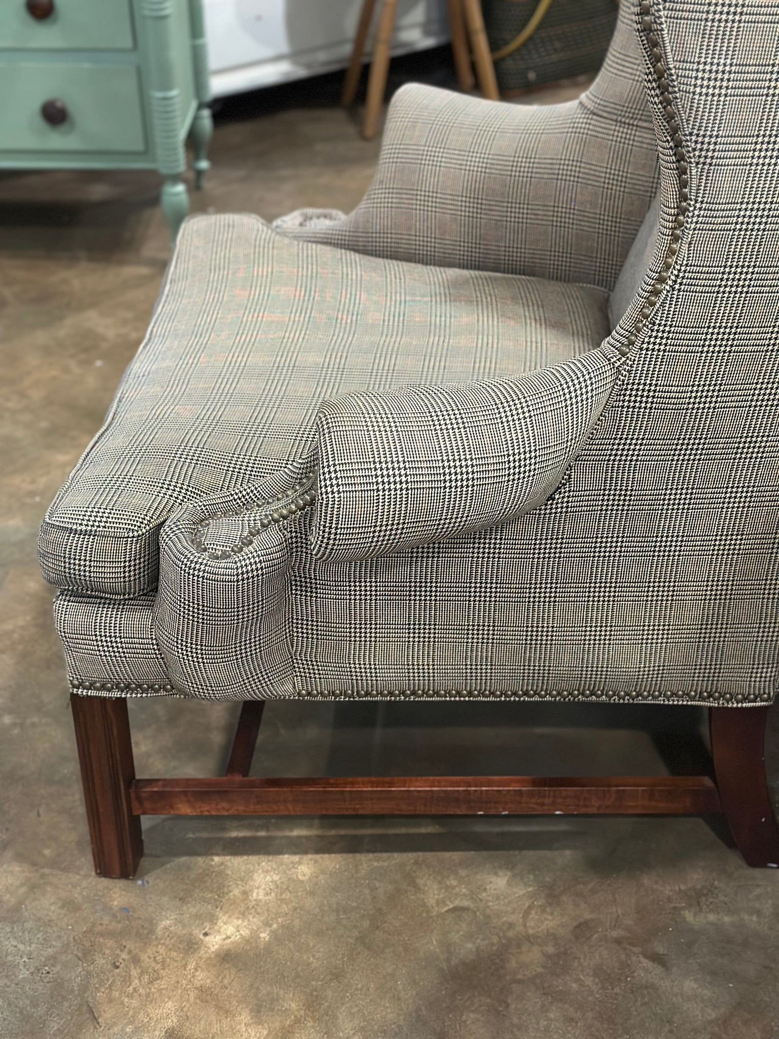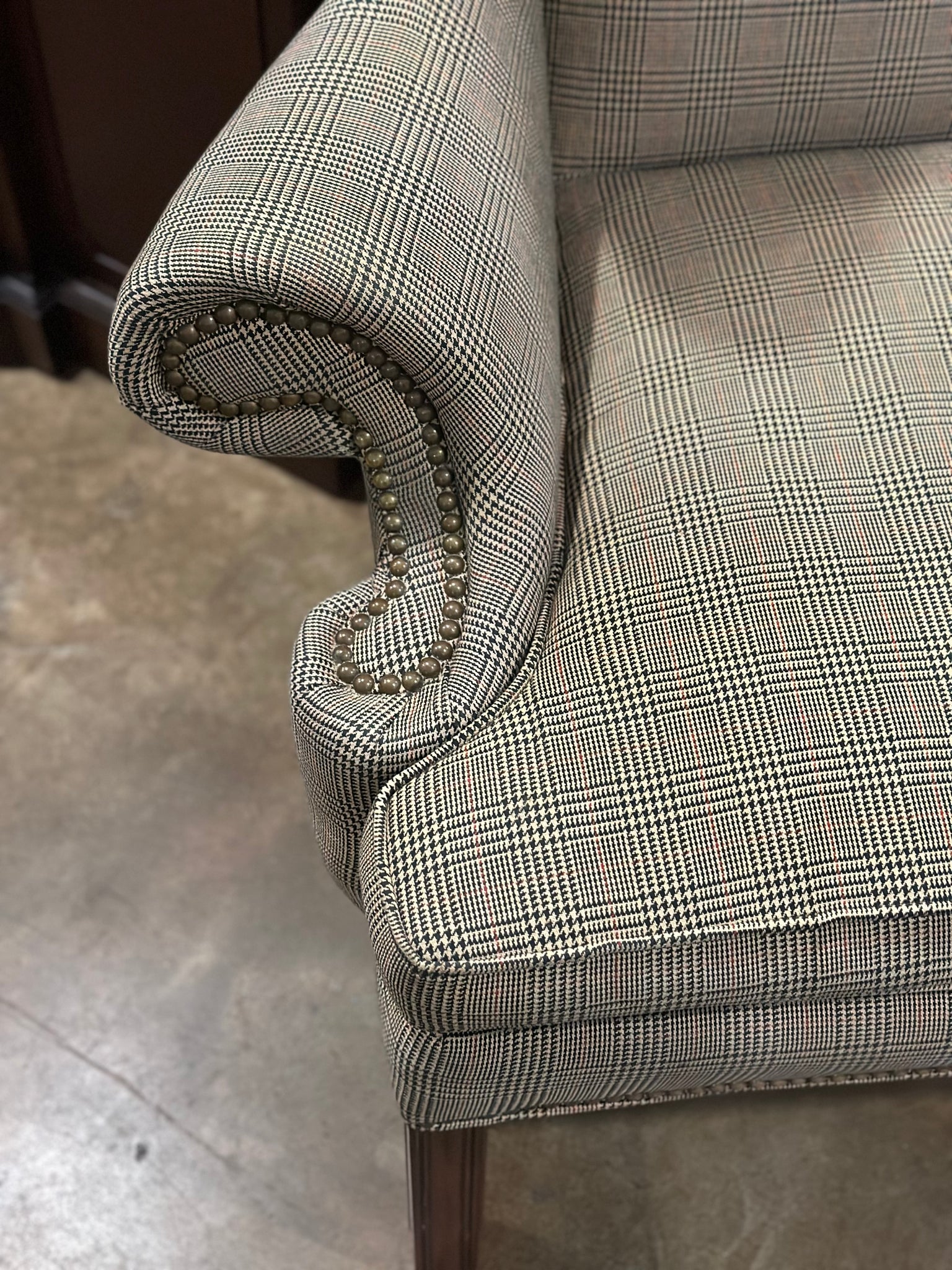 This is a gorgeous Sam Moore by Hooker wingback chair. It is in excellent condition with nailhead trim and a beautiful timeless plaid pattern. It has a goose down blend cushion.