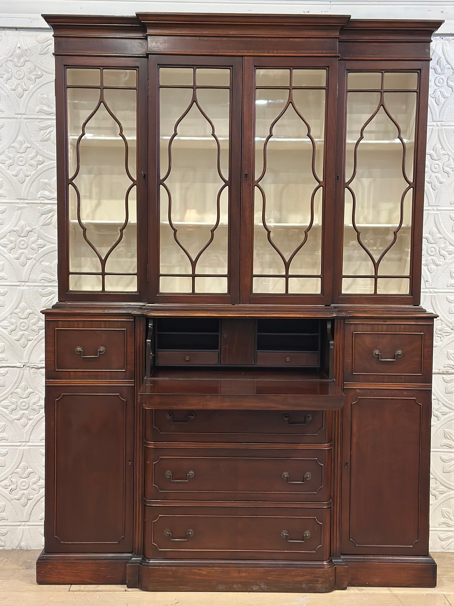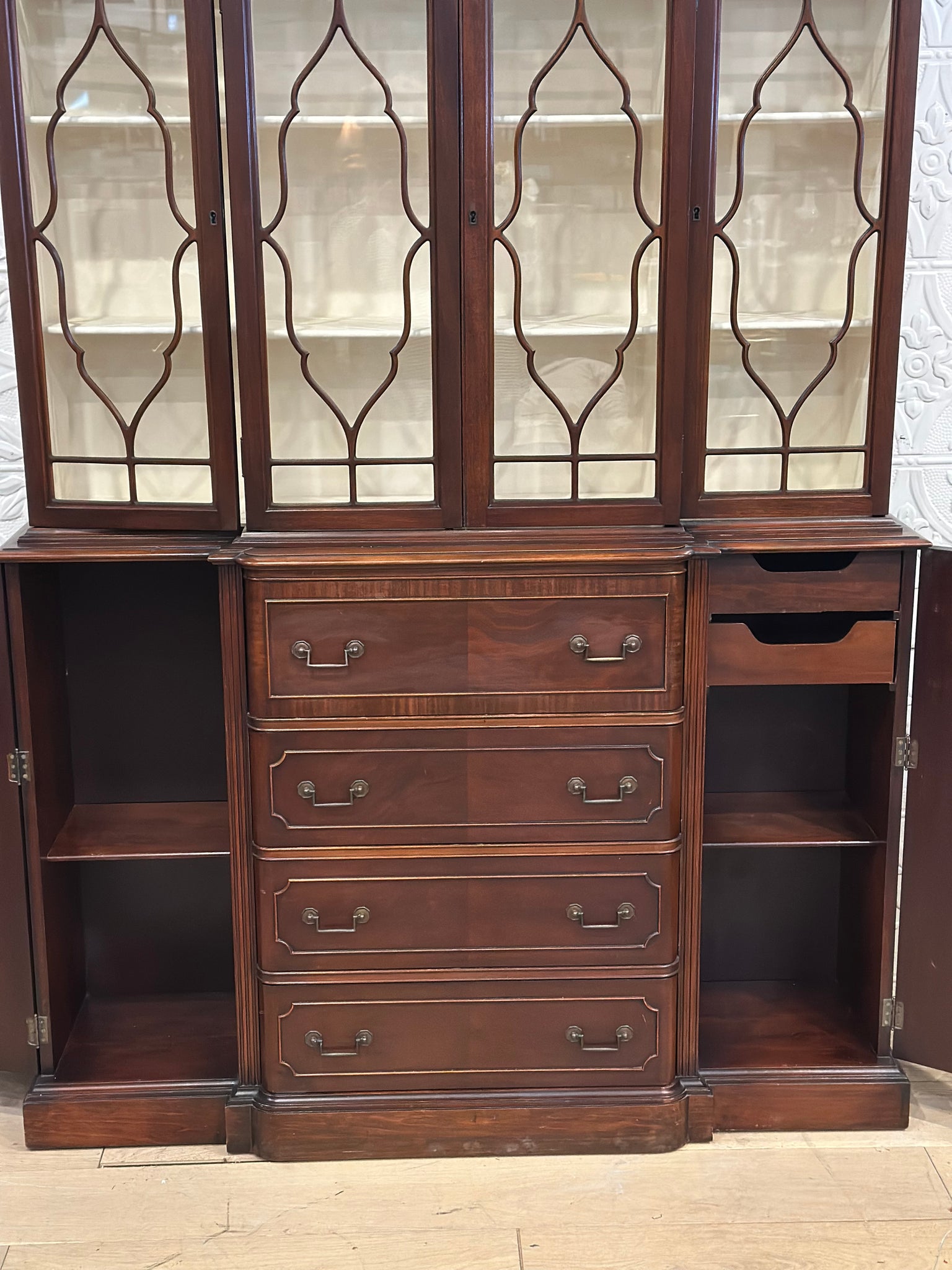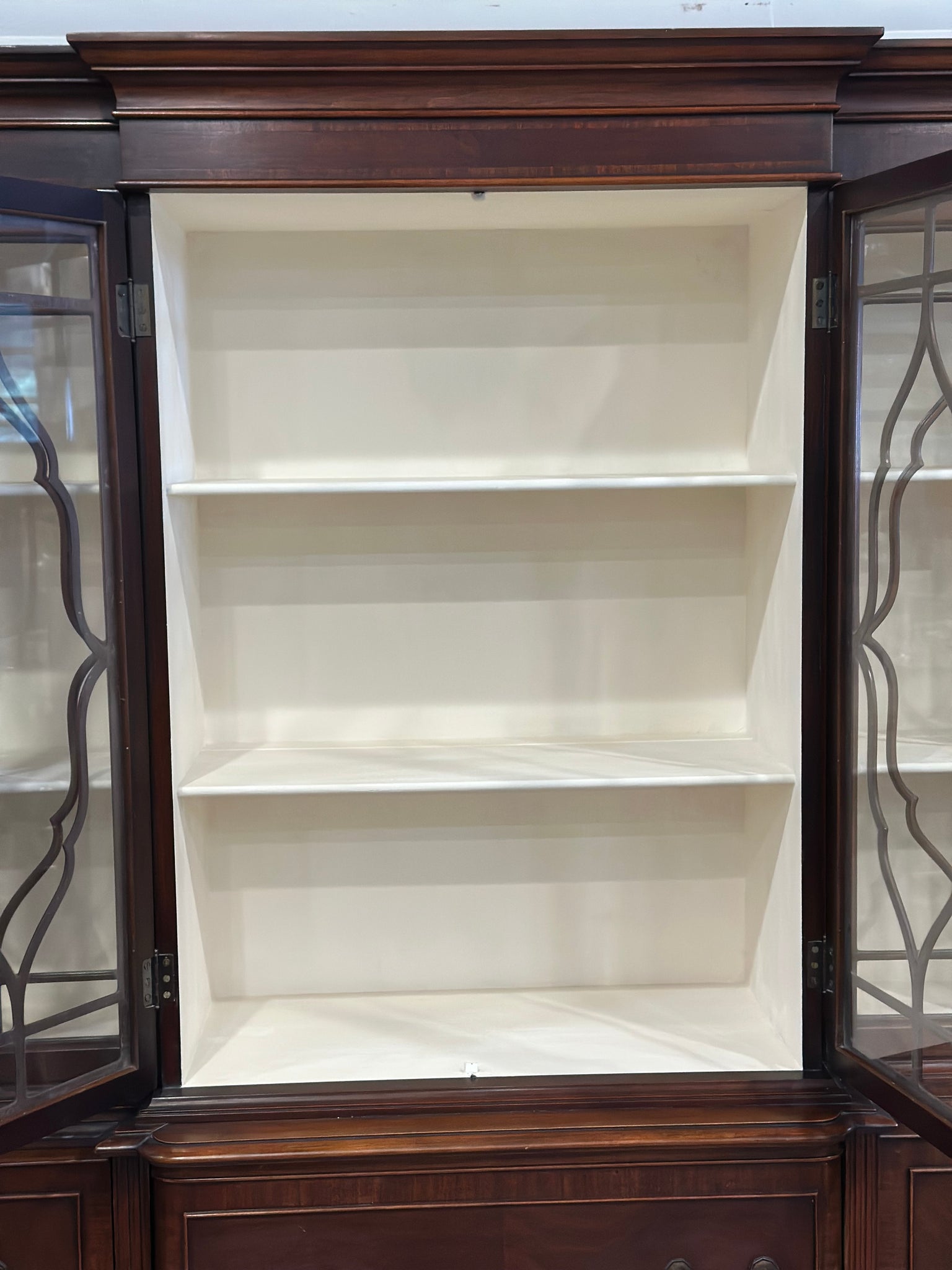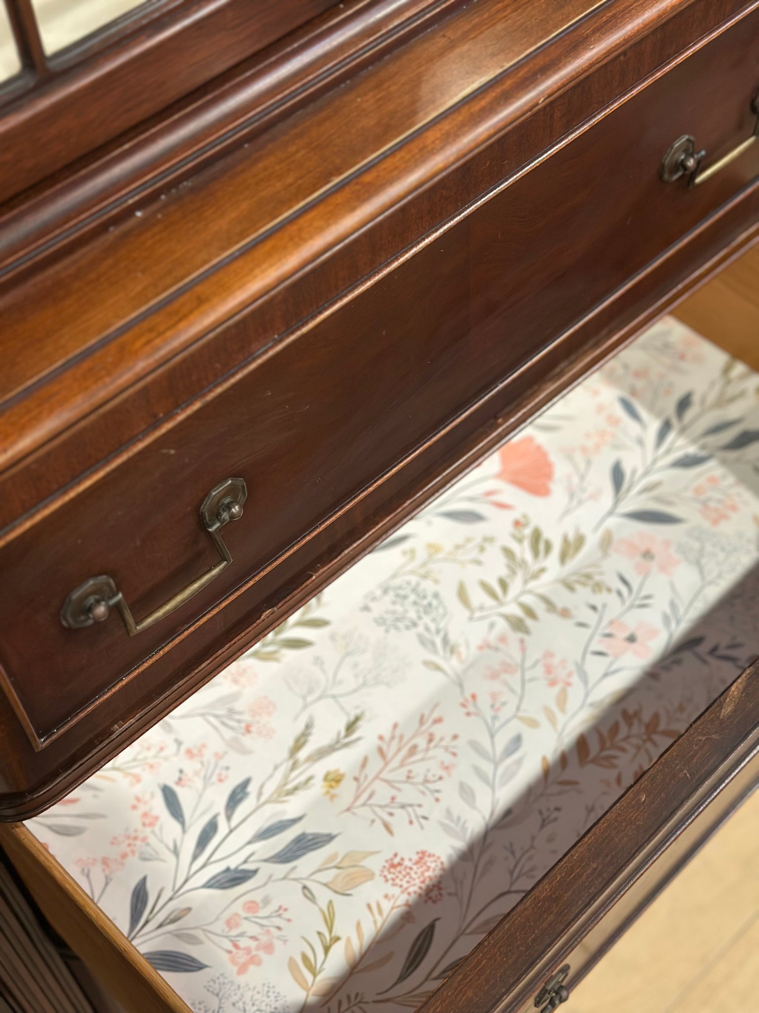 It was too pretty to paint but needed lightening up a bit to show off its pretty fretwork. We painted the inside Annie Sloan original and it’s a real showstopper now. This is one piece and it has functioning locks with a key. The drawers have been lined with pretty paper. Gorgeous, simple and classic for years to come.
