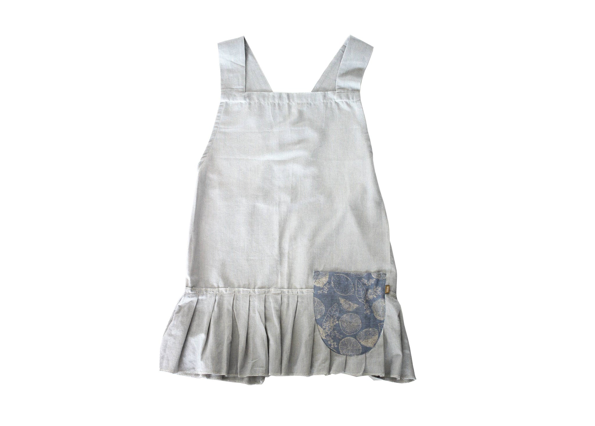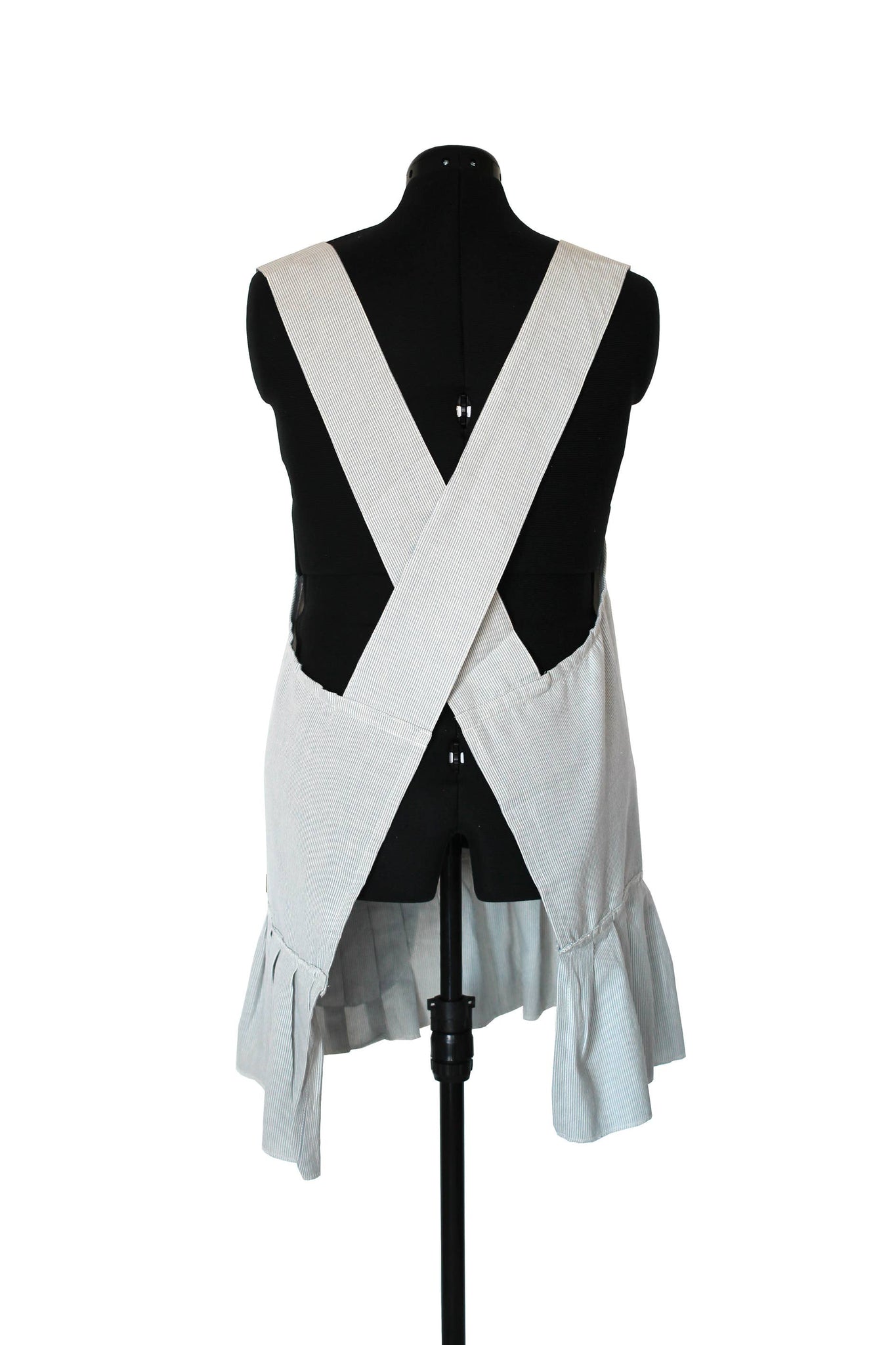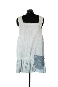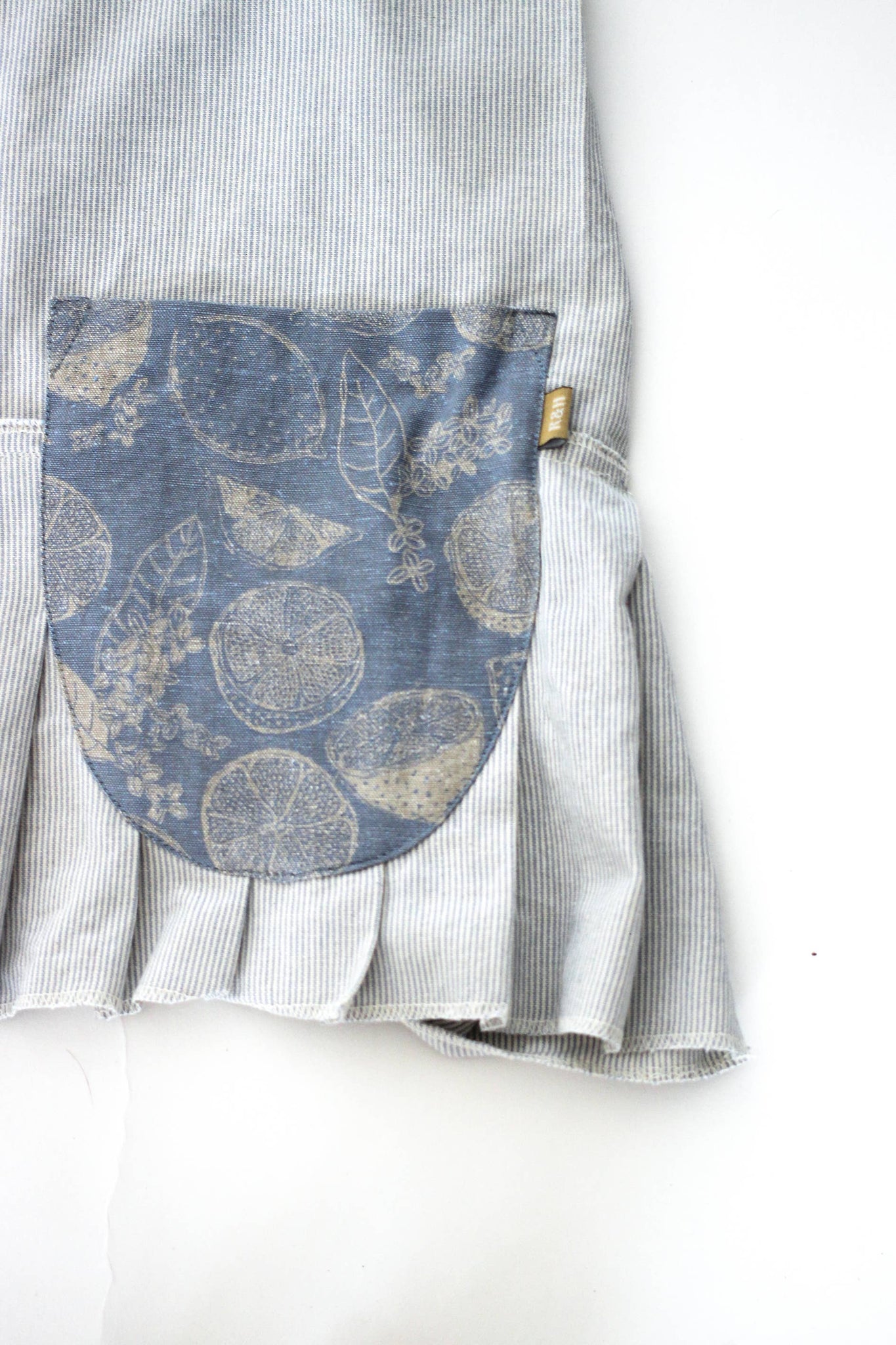 This 100% recycled fabric Pinafore apron features a thin stripe with the Marmalade accent as the pocket. Slips easily over your head. No ties. Generously sized. Ruffled hem. Fun, Flirty, and Functional. Packaged in a recyclable cardboard canister for attractive display and gift giving.